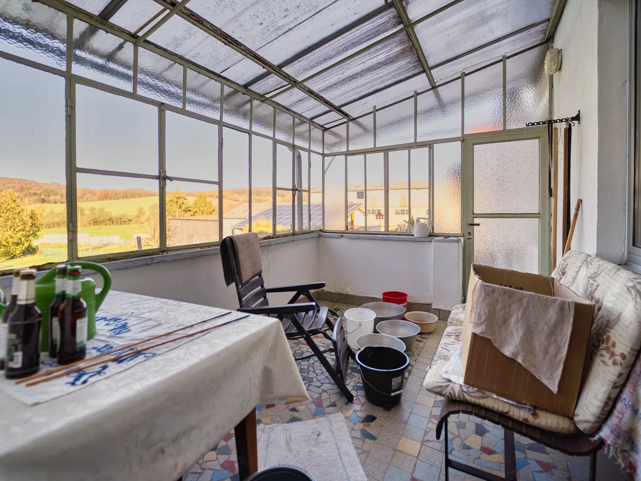 Weitere Hinweise: Das Dach des Wintergartens ist undicht; die Fassadenverkleidung (Giebel/Seite) ist mit Faserzementplatten verkleidet; es kann nicht ausgeschlossen werden, dass diese ggfls. asbesthaltig sind; Wasserhahn im Bad des Erdgeschosses ist defekt; die alte Treppe vom Keller in die Scheune zeigt Anzeichen von Holzwurmbefall; die oberste Geschossdecke des Dachgeschosses muss gedämmt werden.