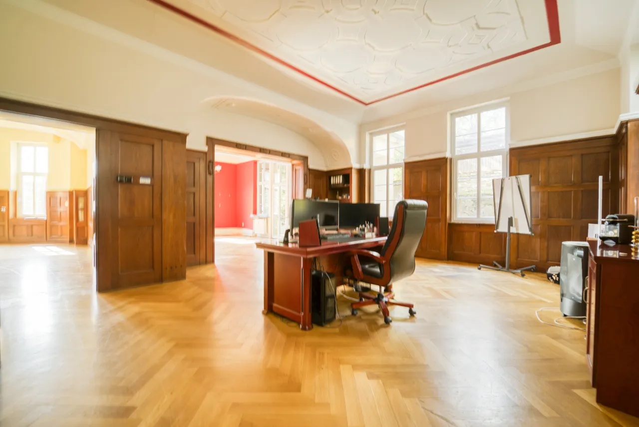 Im Gebäude befinden sich in der 1 Etage mit Holz vertäfelte, besonders repräsentative Büroräume. Auch wäre hier eine Nutzungsänderung zu einer außergewöhnlichen und besonders stilvollen Wohneinheit denkbar.