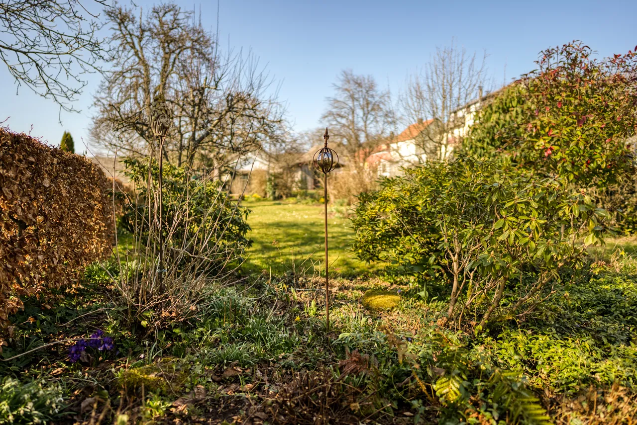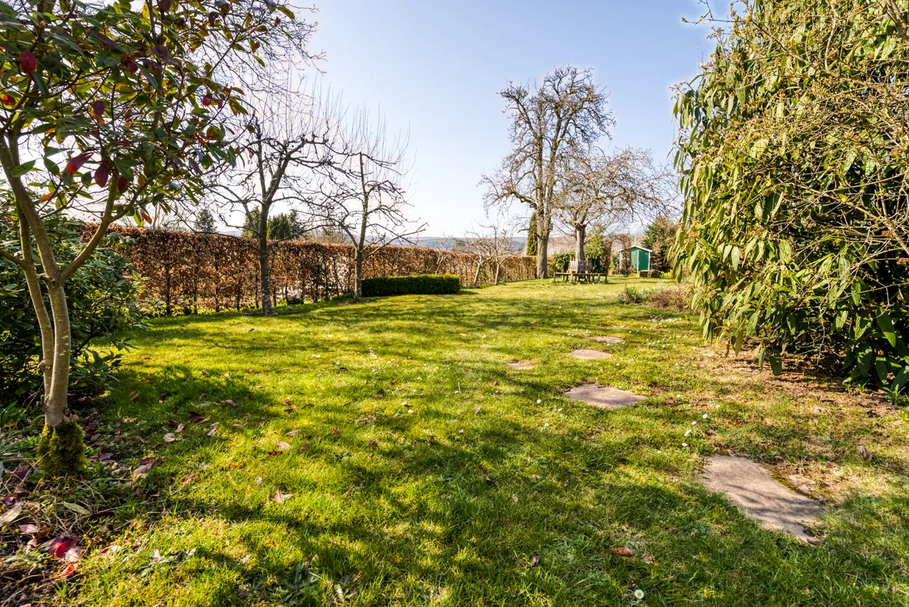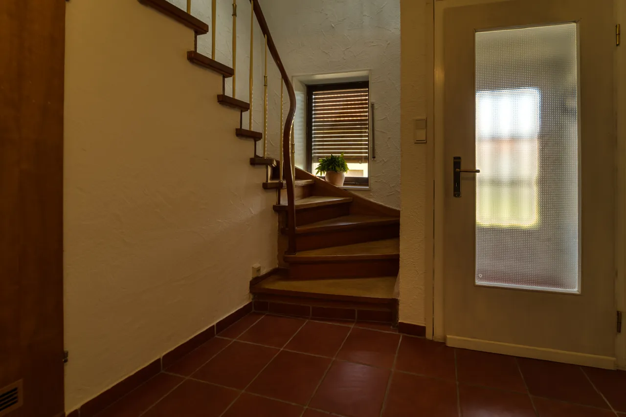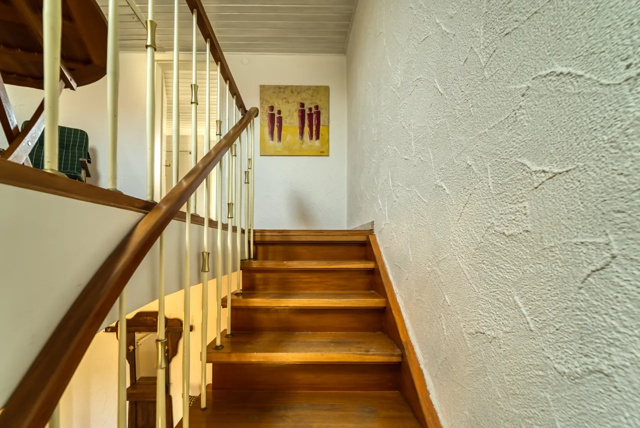 Das Haus selbst verfügt über 3-4 Zimmer, Küche, Bad und ist teilweise unterkellert. Hinterm Haus liegt eine großzügige Terrasse mit direktem Zugang in den Garten.